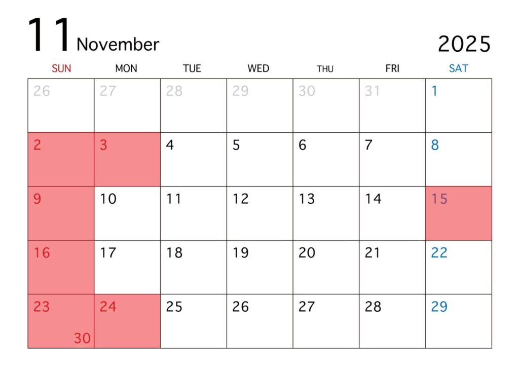 11月の定休日のお知らせ 2025 10/27 ご案内 2025/10/27 2日(日)3日(祝)9日(日)15日(第三土)16日(日)23日(日)24日(祝)30日(日) ご迷惑お掛け致しますがよろしくお願い致します。 定休日は日曜日・祝日・第三土曜日です。 土曜日は15時までの営業となります。 よろしくお願い致します。 ご案内 10月の定休日のお知らせ 関連記事 10月の定休日のお知らせ 2025/09/16 9月の定休日のお知らせ 2025/08/25 8月の定休日のお知らせ 2025/07/15 7月の定休日のお知らせ 2025/06/17 6月の定休日のお知らせ 2025/05/23 5月の定休日のお知らせ 2025/04/17 4月の定休日のお知らせ 2025/03/14 3月の定休日のお知らせ 2025/02/14