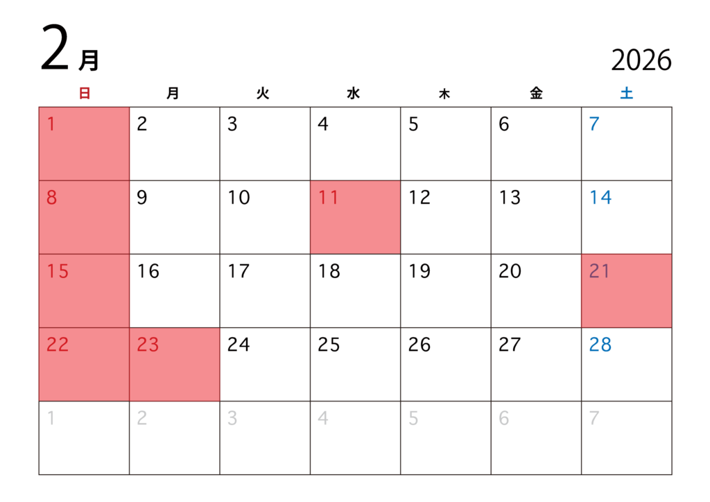 2月の定休日のお知らせ 2026 1/16 ご案内 2026/01/16 1日(日)8日(日)11日(水・祝)15日(日)21(第三土)22日(日) 23(月・祝) ご迷惑お掛け致しますがよろしくお願い致します。 定休日は日曜日・祝日・第三土曜日です。 土曜日は15時までの営業となります。 よろしくお願い致します。 ご案内 1月の定休日のお知らせ 関連記事 1月の定休日のお知らせ 2025/12/26 12月の定休日のお知らせ 2025/11/19 11月の定休日のお知らせ 2025/10/27 10月の定休日のお知らせ 2025/09/16 9月の定休日のお知らせ 2025/08/25 8月の定休日のお知らせ 2025/07/15 7月の定休日のお知らせ 2025/06/17 6月の定休日のお知らせ 2025/05/23