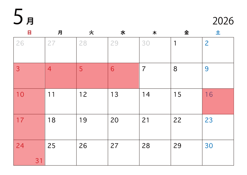 3日(日)4日(月・祝)5日(火・祝)6日(水・祝)10日(日)16日(第三土)17日(日)